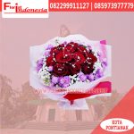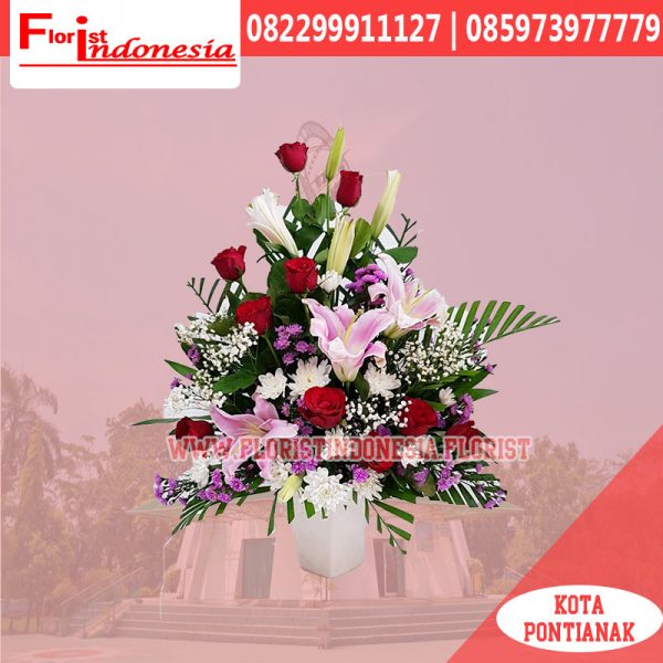Bunga meja pontianak dengan bunga mawar merah segar, bunga krisan dan bunga casablanca
