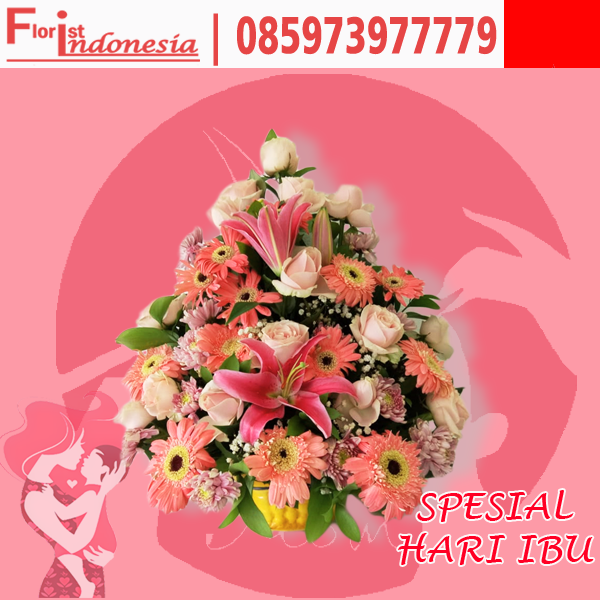 bunga meja hari ibu dengan 15 tangkai bunga garbera pink, 20 tangkai bunga mawar pin dan 3 kuntum bunga casablanca
