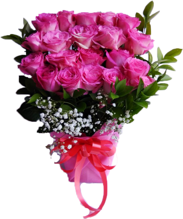 Bunga meja mawar pink, baby breath 20 tangkai dan vas rotan