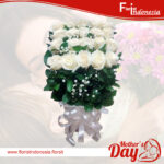 Vas kramik 15 tangkai mawar putih, 20 tangkai mawar merah, dan baby breath