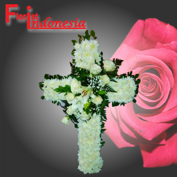 bunga salib dengan bunga krisan putih, mawar putih,dan bunga casablanca menggunaka standing kaki