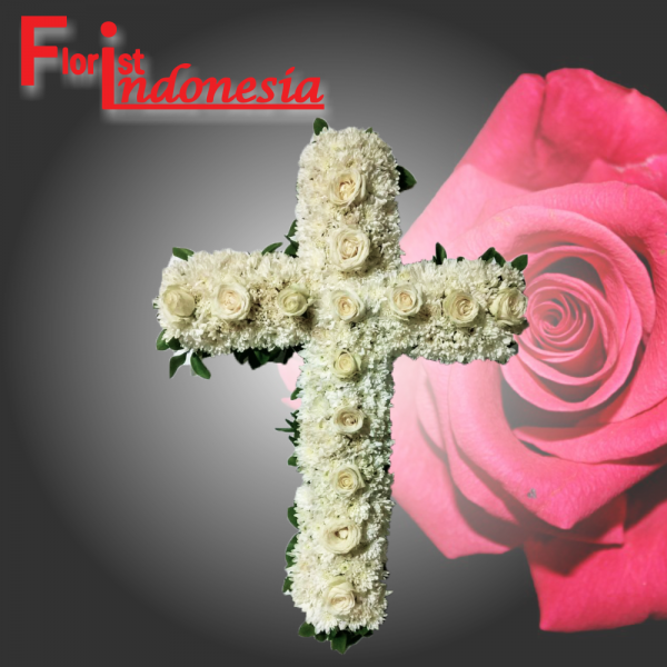 bunga salib dengan bunga krisan putih dan bunga casablanca menggunaka standing kaki